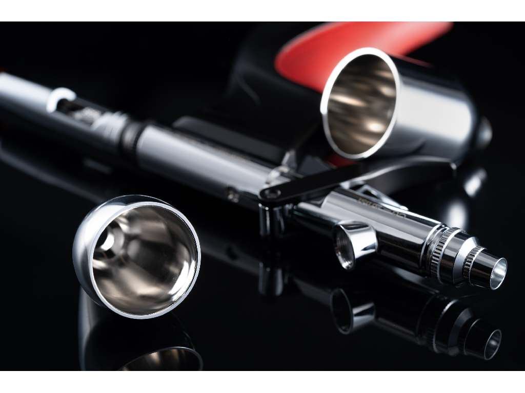 Zrcadlově vyleštěné kalíšky na barvu: Airbrush je dodáván se dvěmi leštěnými kalíšky (10 ml a 20 ml), upravenými do zrcadlového lesku pro snadné čištění a rychlou změnu barvy. Tím se zabrání usazování barvy a šetří čas při čištění.