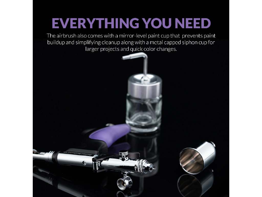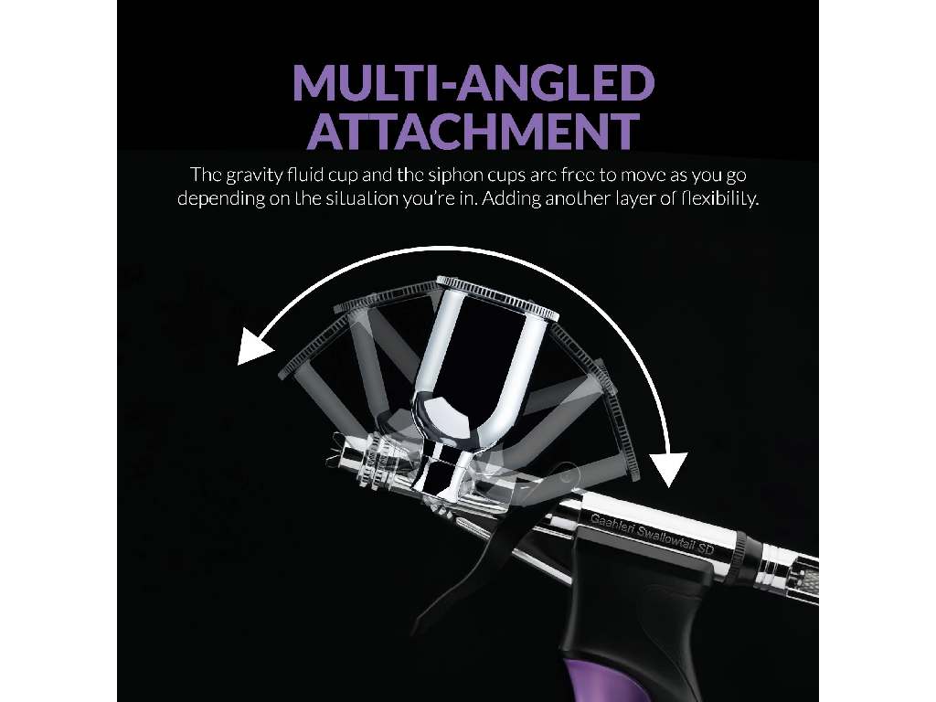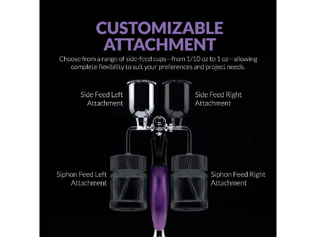 Přizpůsobitelné, víceúhlové nástavce: Vyberte si z nádobek s bočním napojením od 3 ml do 30 ml. Tato flexibilita umožňuje přizpůsobit airbrush konkrétnímu projektu a preferencím.