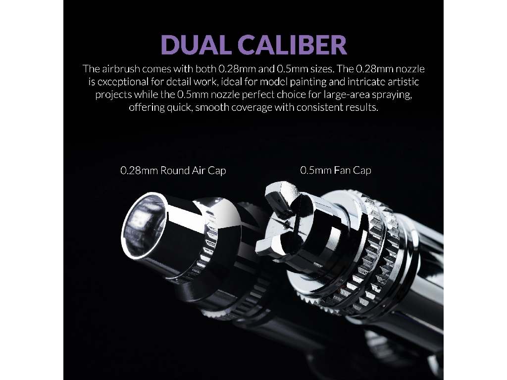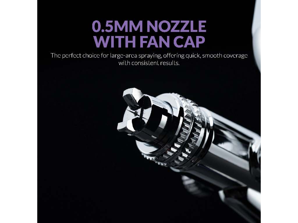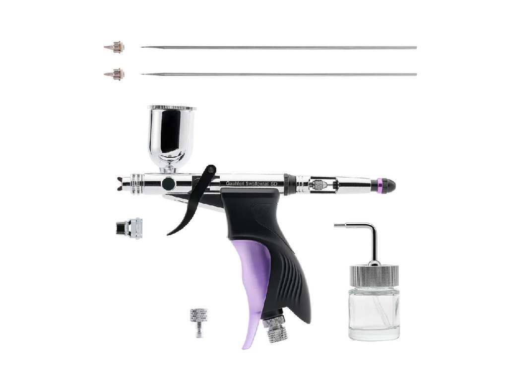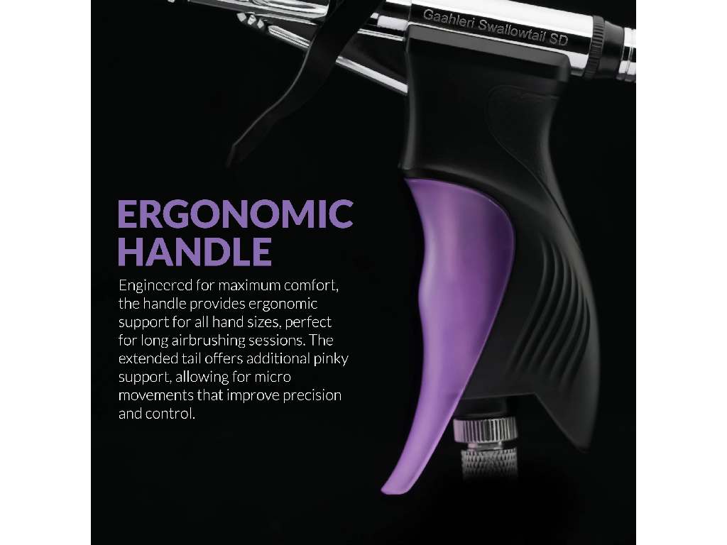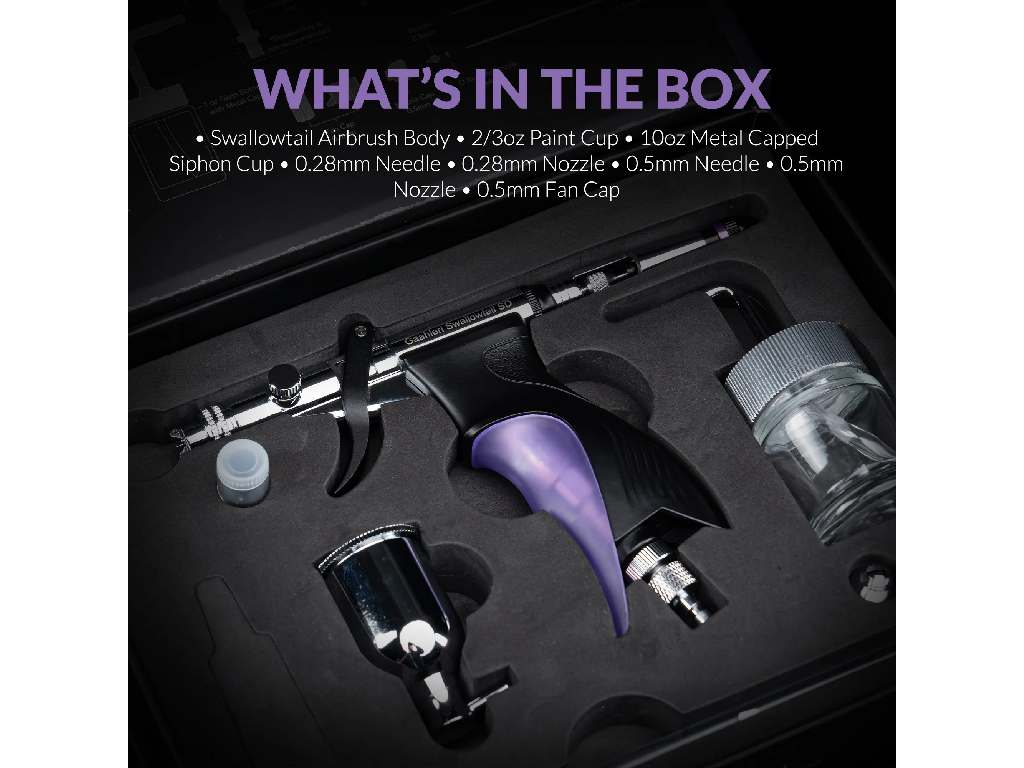 Dvě možnosti rozměrů: Swallowtail SD je vybavený jak 0,28mm, tak 0,50mm tryskami a jehlami a je perfektní pro různé aplikace. 0,28mm tryska poskytuje výjimečné detaily pro jemné umění, zatímco 0,50mm tryska s vějířovým uzávěrem zajišťuje rychlé a hladké pokrytí pro velkoplošné nástřiky.