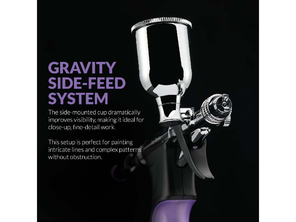 Gravity Side-Feed System: Boční kalíšek dramaticky zlepšuje viditelnost, takže je ideální pro složité linie a složité vzory. Dosáhněte práce s jemnými detaily bez překážek. Ideální pro přesné úkoly zblízka.