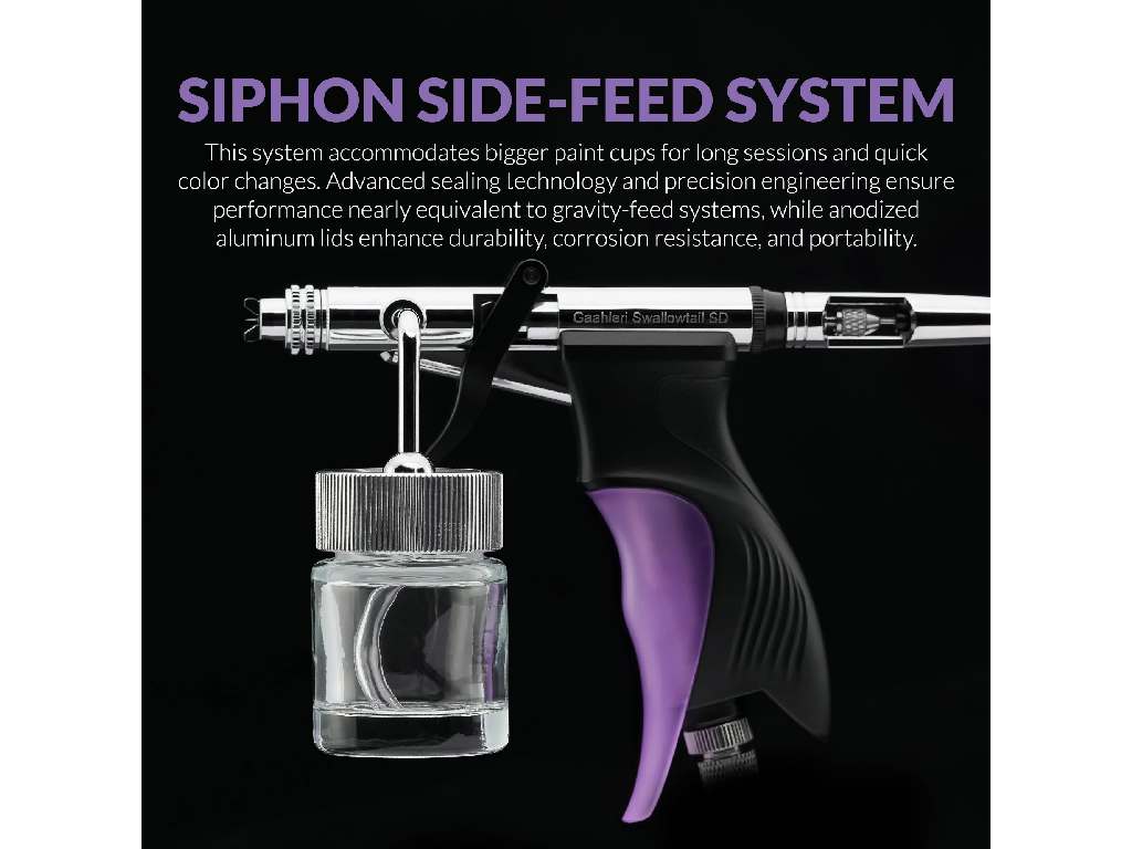 Siphon Side-Feed System: Zvládněte bez námahy časově náročné projekty a snadné změny barvy s větší skleničkou na barvu. Pokročilé těsnění a přesné inženýrství zajišťují výkon na stejné úrovni jako systémy horního (gravitačního) plnění. Kvalitní víčka z eloxovaného hliníku zvyšují odolnost proti korozi.