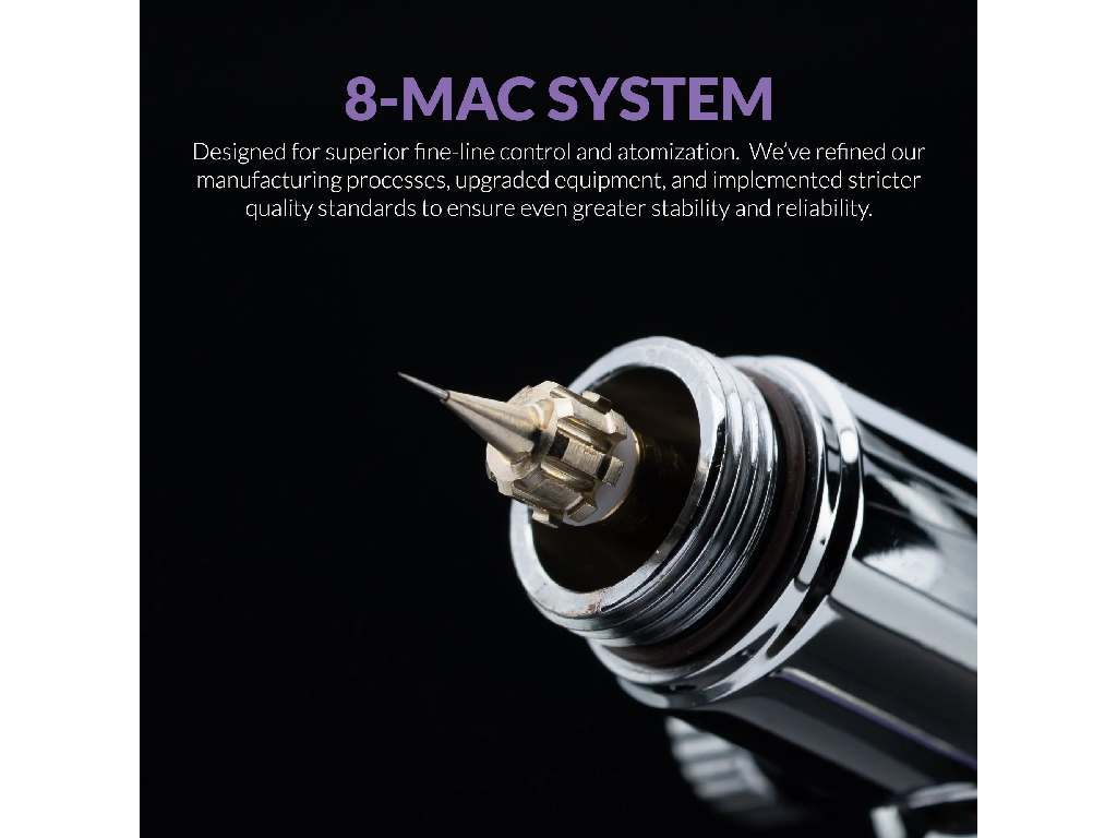 Systém 8-MAC: Pokročilá tvorba jemných linek a atomizace barvy jsou zaručeny prostřednictvím zdokonalených výrobních procesů a přísnějších norem kvality, což zajišťuje konzistentní výkon a spolehlivost.