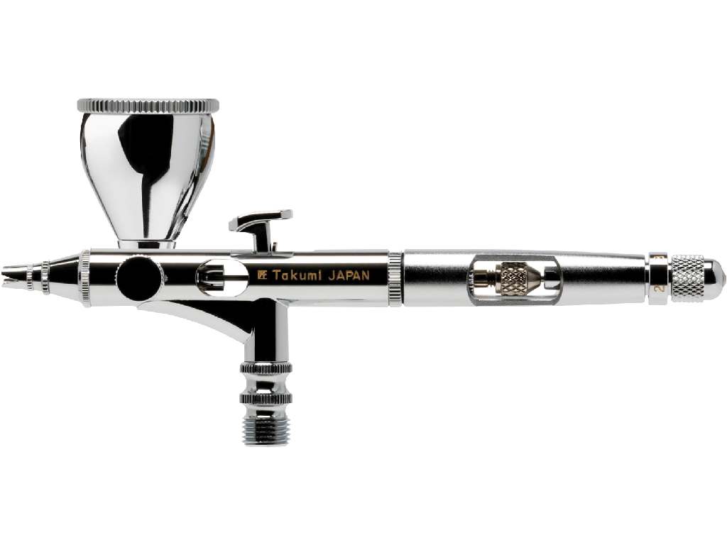 Model Takumi je vybaven nejmenší tryskou 0,18 mm a bočním kalíškem o objemu 7 ml, který se dá umístit jak vlevo, tak vpravo.