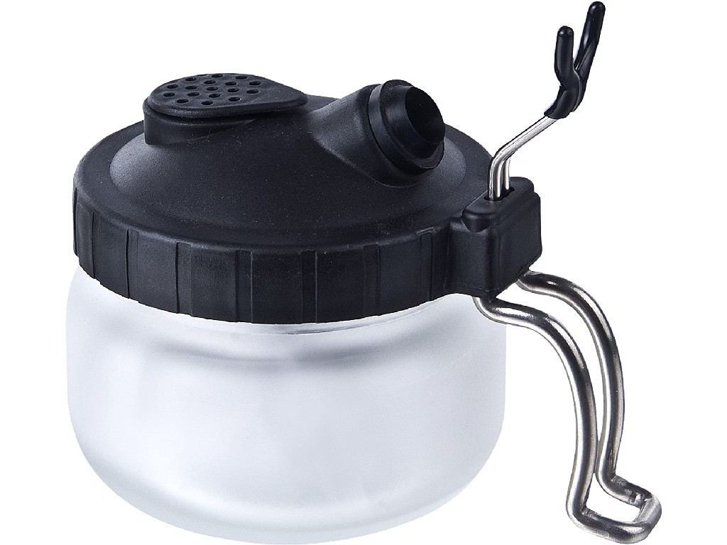 Kvalitní německá čistící nádoba.Slouží jako čistící nádoba k bezpečnému odstřiku barvy z pistole při změně barvy v pistoli, ale také pro závěrečné vyčištění pistole po práci.Nádobka je využitelná i jako stojánek na pistoli.