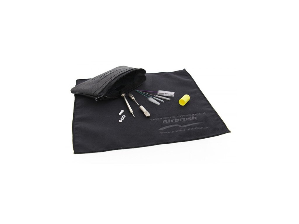 Kompletní sada pro údržbu airbrush pistolí Harder & Steenbeck v praktickém koženém pouzdře.