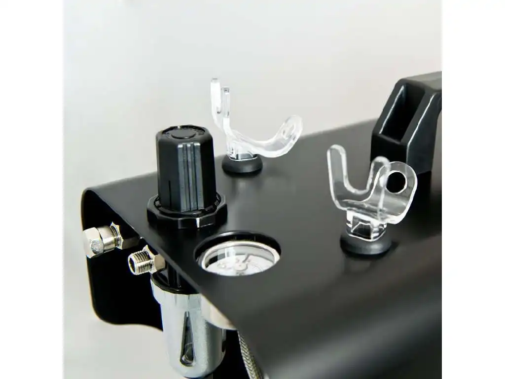 Výbava: Regulátor tlaku, manometr, odkalovací nádobka, závit G 1/8, plechový kryt s držadlem, 2x univerzální držák pistole